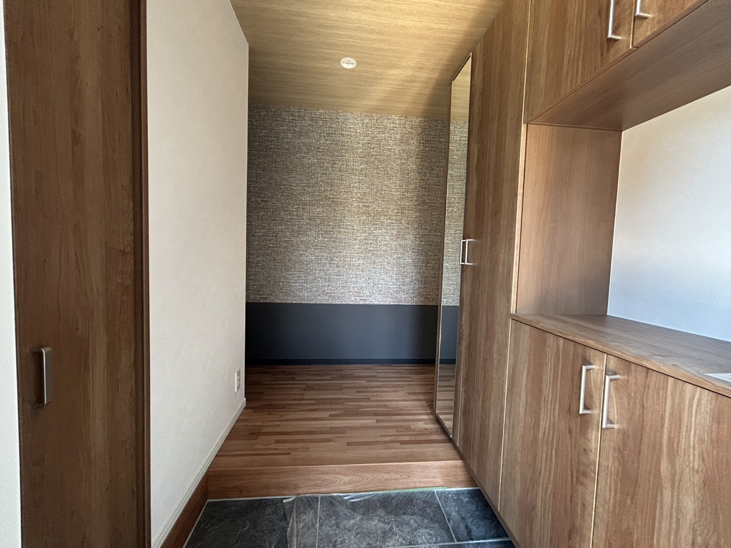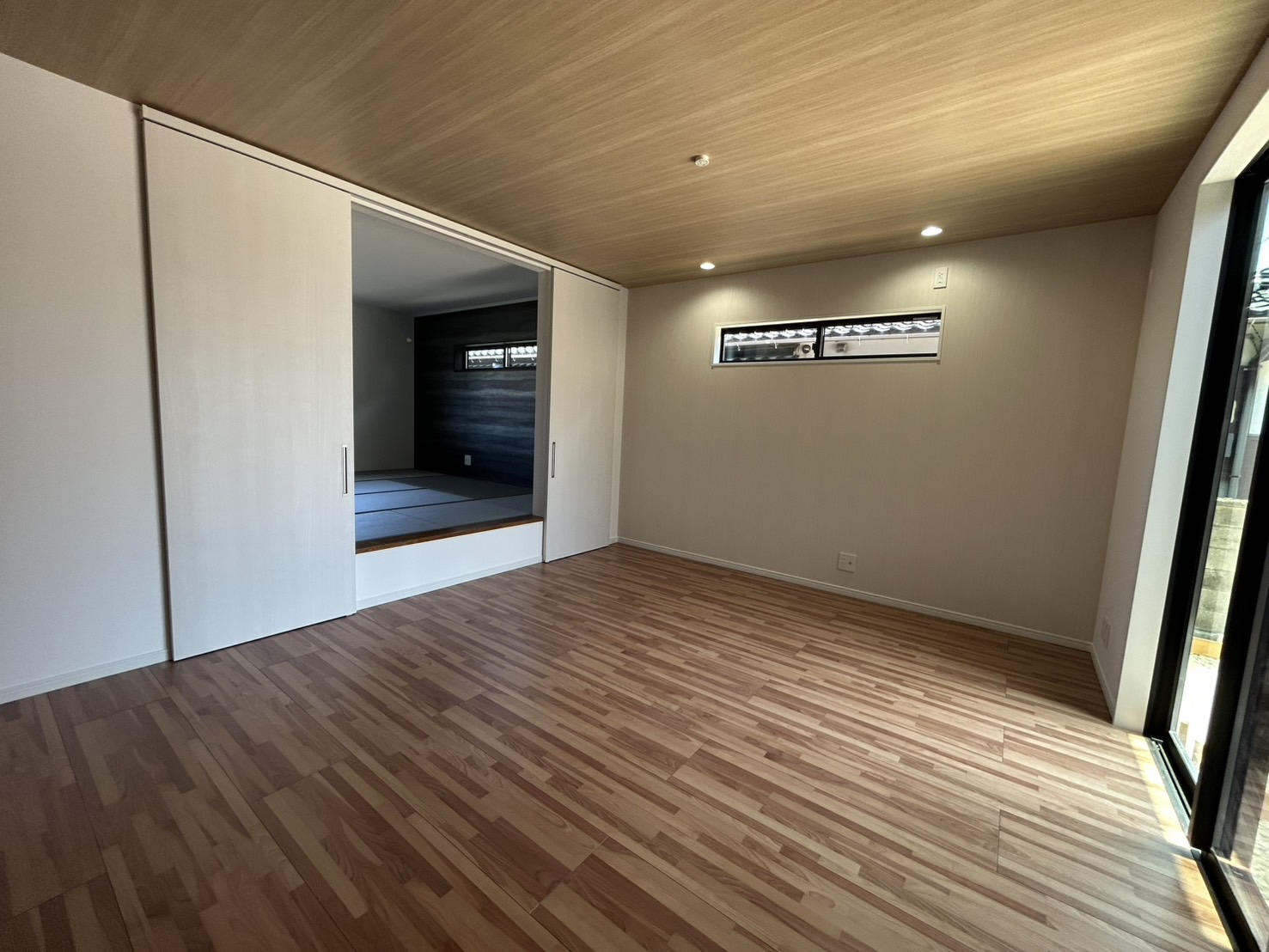 ホール~LDKの床には無垢板を採用し、和室は小上がりといたしました。