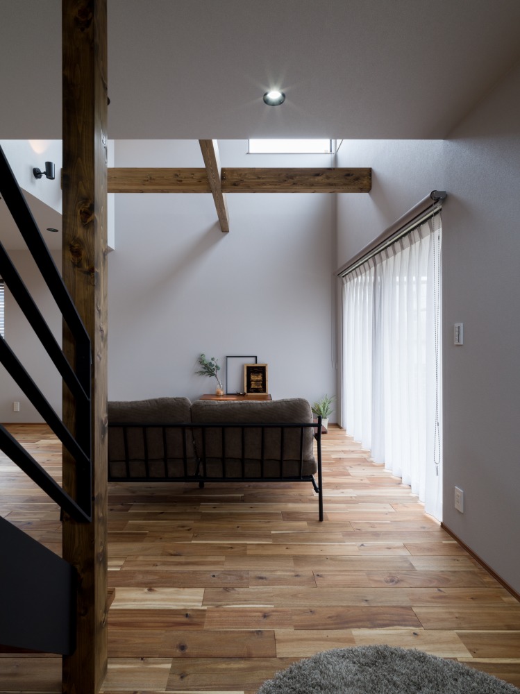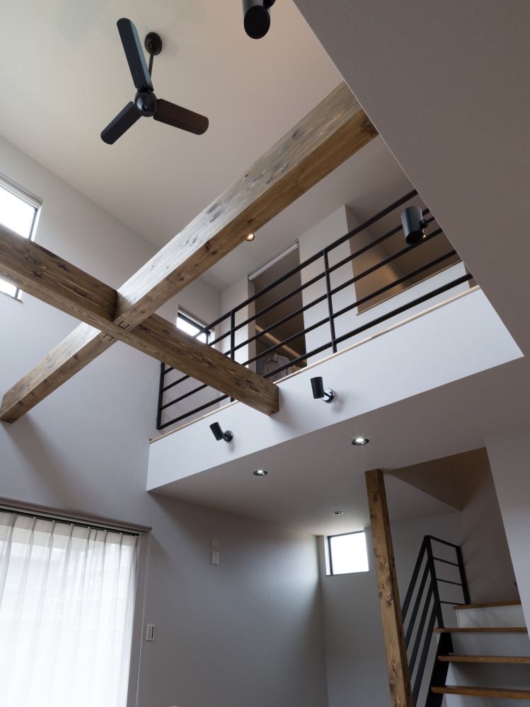 吹き抜けには、化粧梁やオリジナルアイアンの手すりを取り入れ、印象的なアクセントに。